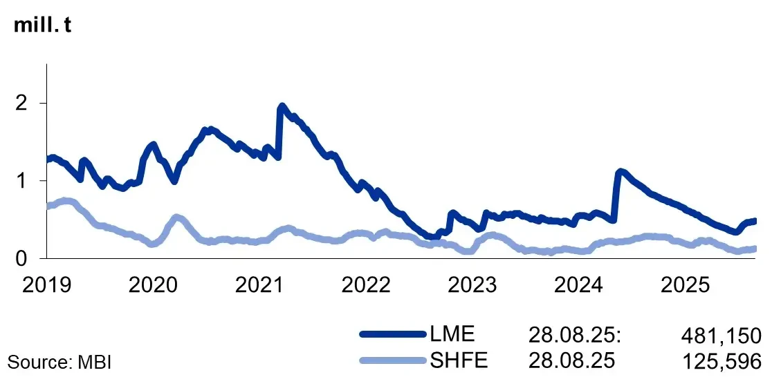 Le scorte di alluminio hanno mostrato uno sviluppo relativamente uniforme complessivamente nell'agosto 2025 sullo SHFE e sul LME. Sullo SHFE, le scorte nei magazzini sono aumentate in media dell'8,5% nel corso del mese, mentre sul LME sono aumentate del 6,7% nello stesso periodo.