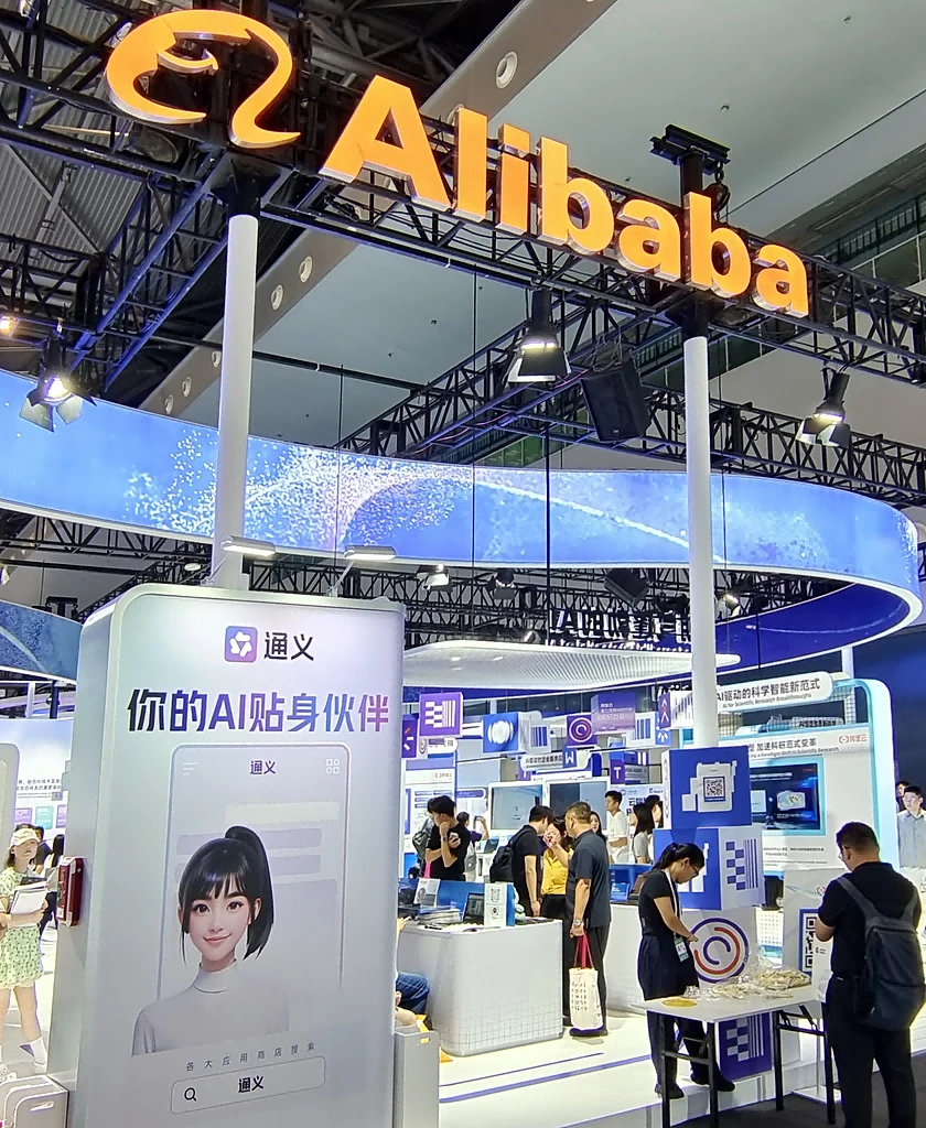 Alibaba presenta i suoi ultimi prodotti tecnologici alla Conferenza Mondiale sull'Intelligenza Artificiale tenutasi a Shanghai il 28 luglio 2025.